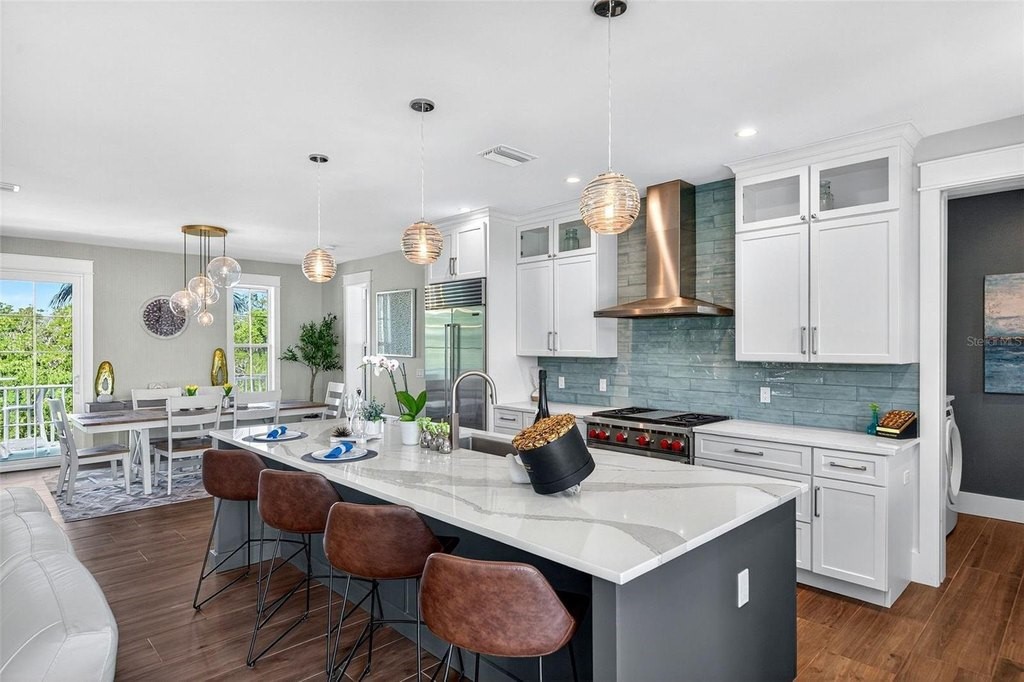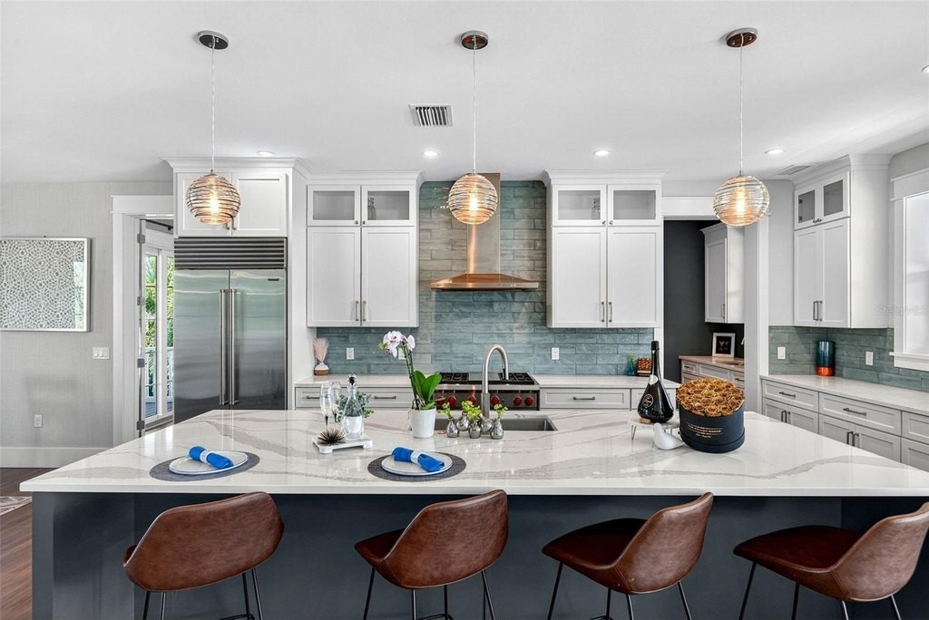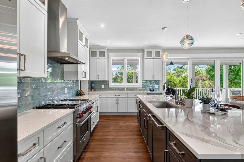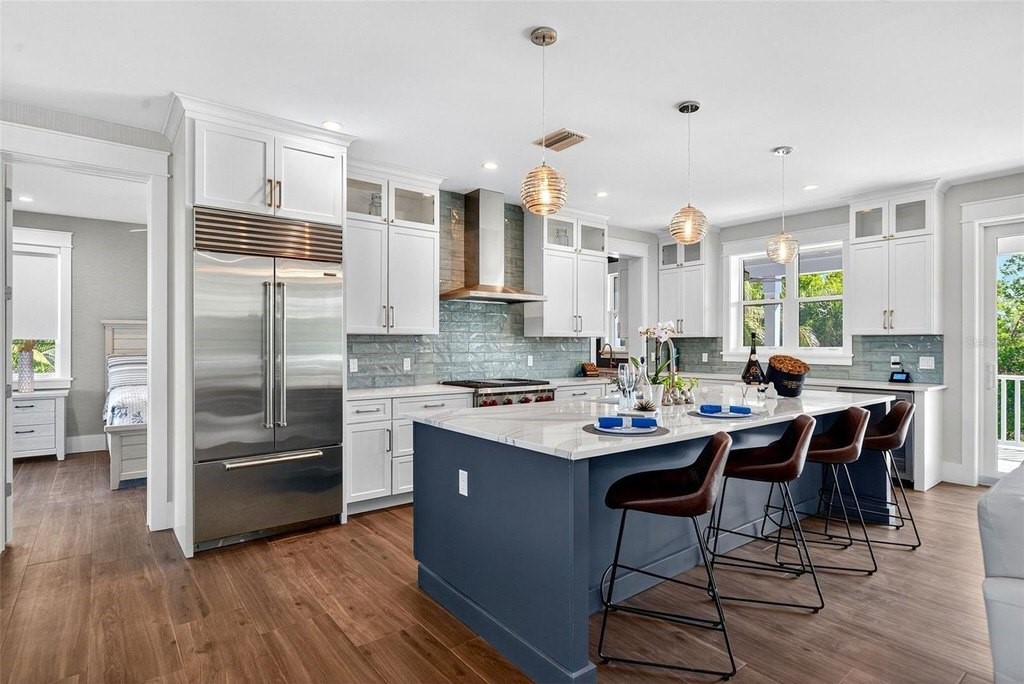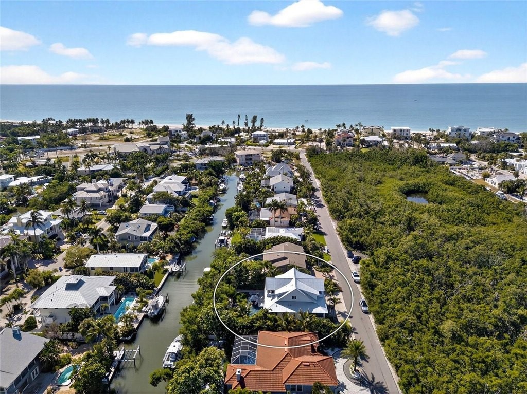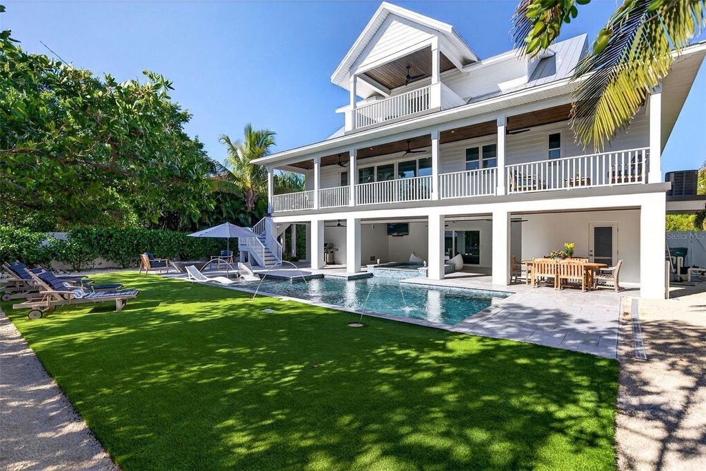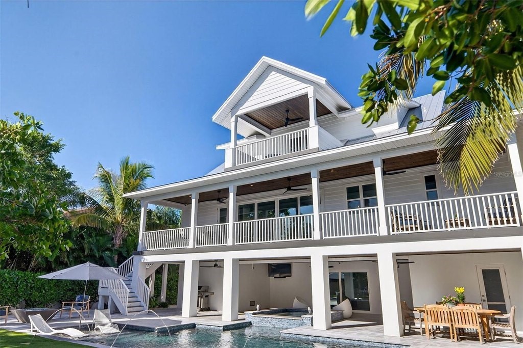 Experience the pinnacle of coastal luxury in this exceptional custom estate, completed in 2021 by renowned Mason Martin Builders. Designed and sparingly used by the original owners who crafted it with precision and care, this like-new residence has since been thoughtfully reimagined by the current owner with an elevated level of designer finishes and enhancements throughout. Situated near the desirable north end of Longboat Key on a tranquil canal with a private dock and boat lift, this home provides effortless access to the open Gulf waters—an ideal setting for boating enthusiasts. Deeded neighborhood beach access just moments away completes the ultimate Florida lifestyle for those who cherish both sea and sand. This three-story architectural gem offers three spacious ensuite bedrooms, three-and-a-half baths, and the ease of a private elevator. Expansive balconies with wood-clad ceilings connect each floor, blending indoor elegance with outdoor serenity. Natural light pours through floor-to-ceiling sliding glass doors, accentuating peaceful water and garden views from every level. At the heart of the home, the gourmet kitchen boasts Sub-Zero and Wolf appliances, quartz countertops, and bespoke cabinetry—perfect for both everyday living and entertaining. The entire third floor is dedicated to a luxurious primary suite retreat with spa-style bath, soaking tub, oversized walk-in shower, dual vanities, and custom closets. The private outdoor sanctuary includes a resort-style pool and spa, fire pit, covered lounge space, and expansive sun deck—perfect for sunset gatherings or quiet afternoons in the sun. Professional xeriscaping, mature privacy plantings, and enhanced landscape lighting create a serene, low-maintenance environment. Notable upgrades include a newly constructed three-foot perimeter seawall, advanced drainage and waterproofing systems, and impact-rated windows and doors for peace of mind. Inside, premium upgrades such as commercial-grade European wall coverings, high-end fans and hardware, and designer window treatments ensure every detail reflects refined sophistication. With its prime waterfront location, nearly new condition, and elevated design, this rare offering embodies the essence of Longboat Key luxury for the active